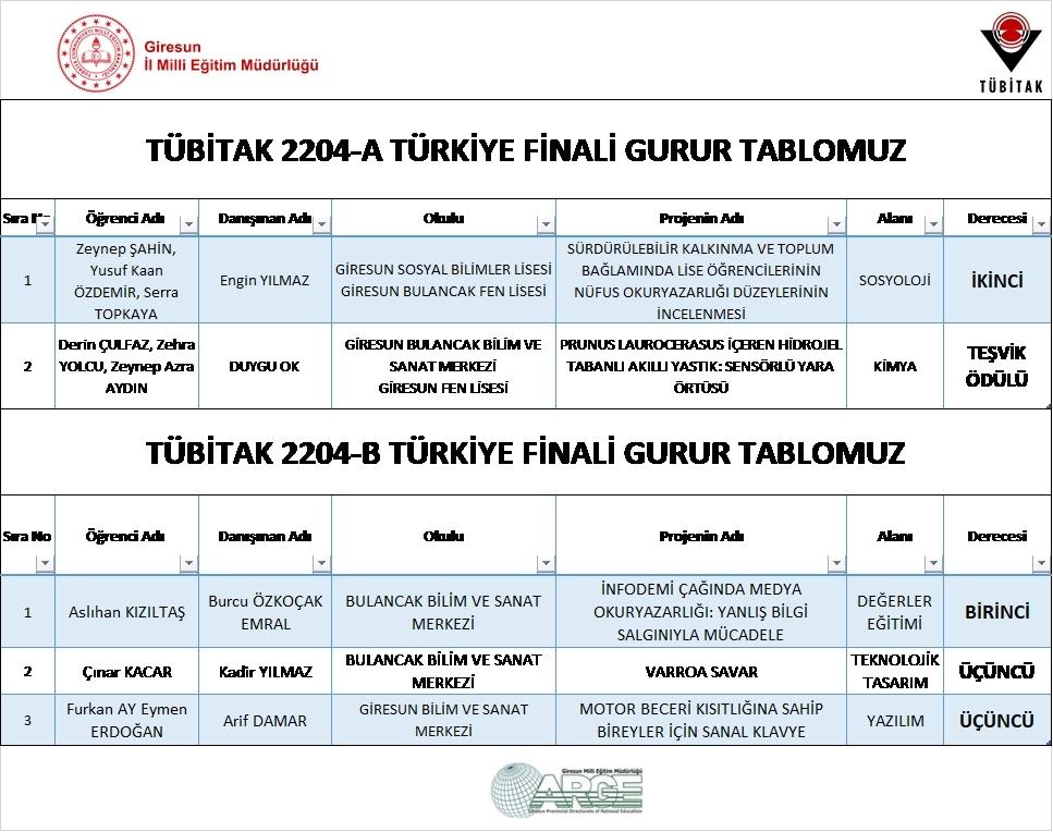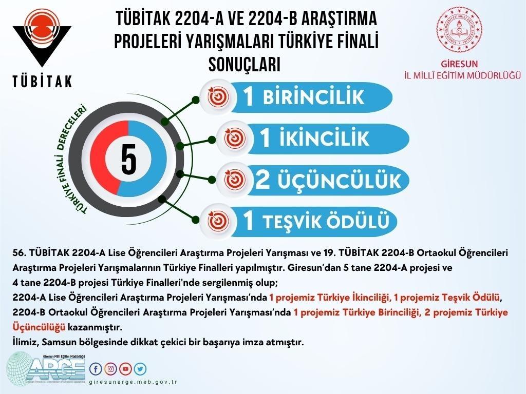 TÜBİTAK tarafından yürütülen 56. TÜBİTAK 2204-A Lise Öğrencileri Araştırma Projeleri Yarışması ile 19. TÜBİTAK 2204-B Ortaokul Öğrencileri Araştırma Projeleri Yarışmasının Türkiye finalleri ve ödül töreni, bu yıl birlikte düzenlendi. Yarışmalar, 25–28 Mayıs 2025 tarihleri arasında Ankara'da gerçekleştirildi. İlimizden beş tane 2204-A Projesi, dört tane 2204-B Projesi ile toplam dokuz projeyle Türkiye Finallerine katılım sağlandı. Toplamda beş derece kazanıldı.